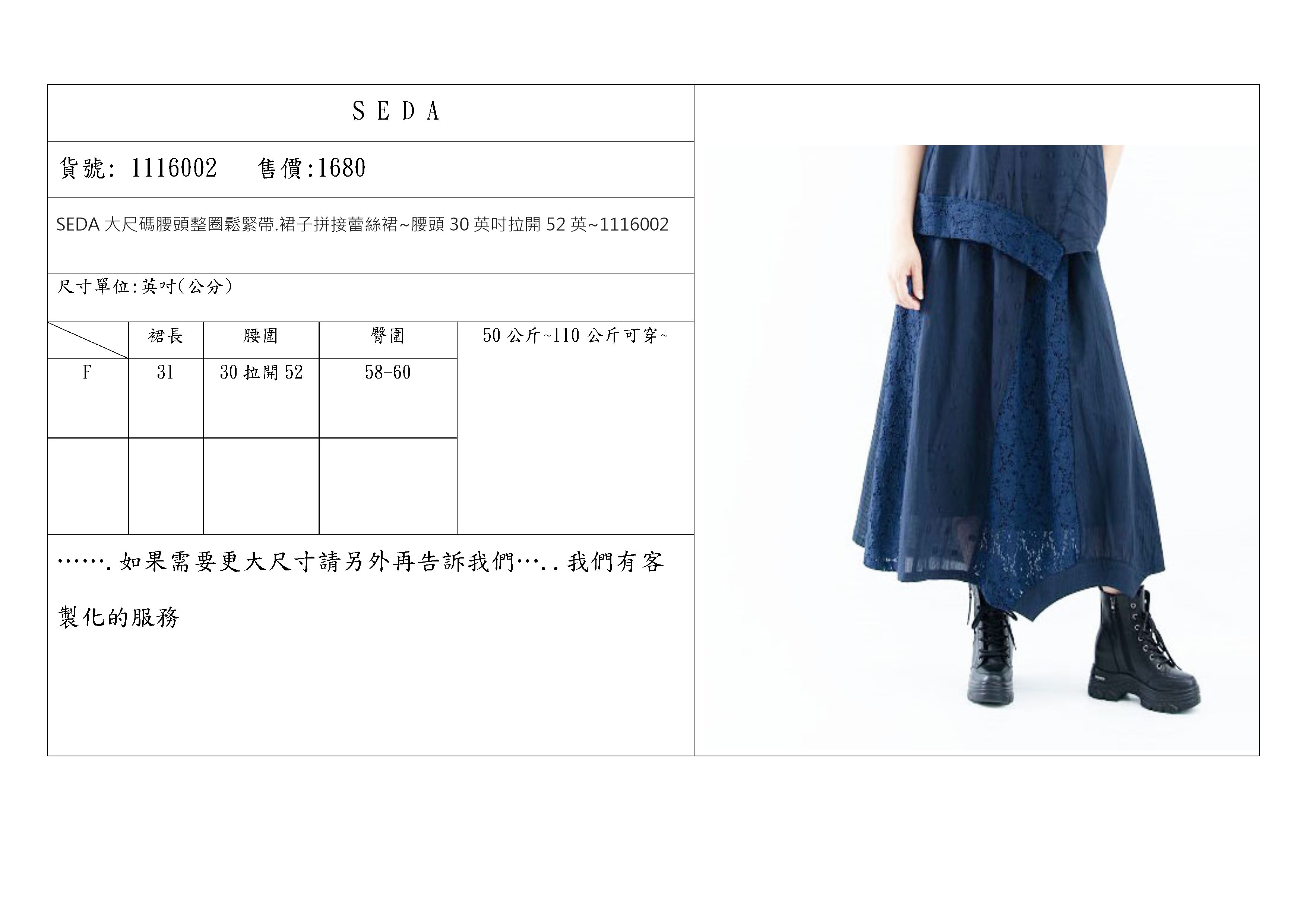 SEDA 大尺碼腰頭整圈鬆緊帶.裙子拼接蕾絲裙~腰頭30英吋拉開52英吋~1116002